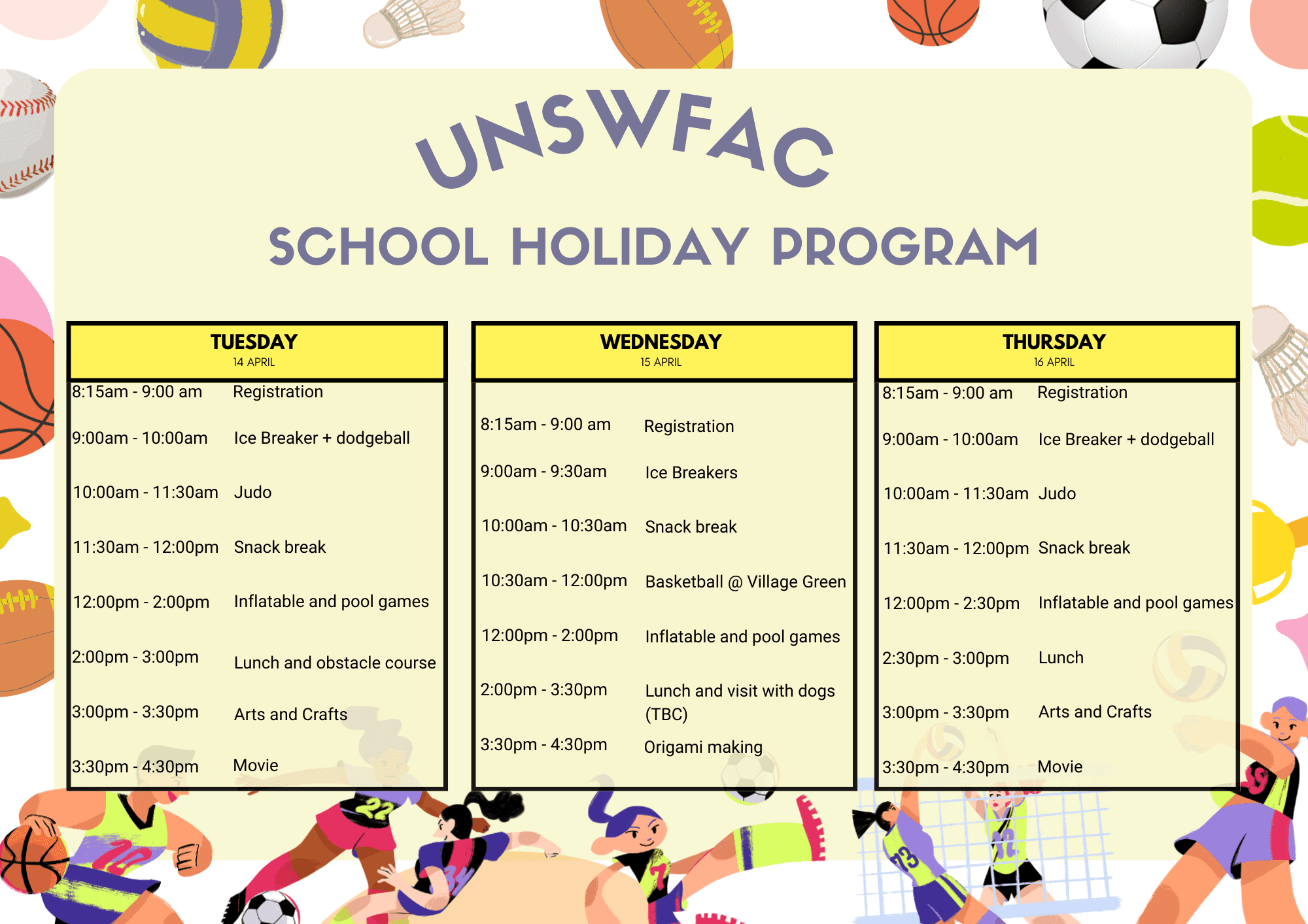 The UNSW Fitness & Aquatic Centre runs fun, safe, creative and inclusive school holiday programs that is open to both the UNSW and wider local community. Our structured programs are carefully designed to keep kids active, social, and smiling with an exciting mix of sports, pool time, creativity, and furry friends! These programs have been designed for children aged between 6-years-old and 13-years-old.